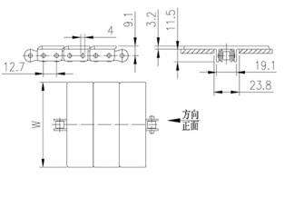 主要適合應用在各種高速直線及拉力較大輸送 機上。 材質:卡板為POM,底鏈為08A滾子鏈,碳鋼或不銹鋼制造 使用溫度:-40~90℃ 包裝:1.524米/根 最高速度:80米/分 潤滑劑,50米/分 干燥劑 工作載荷:碳鋼為1600N,不銹鋼為1200N